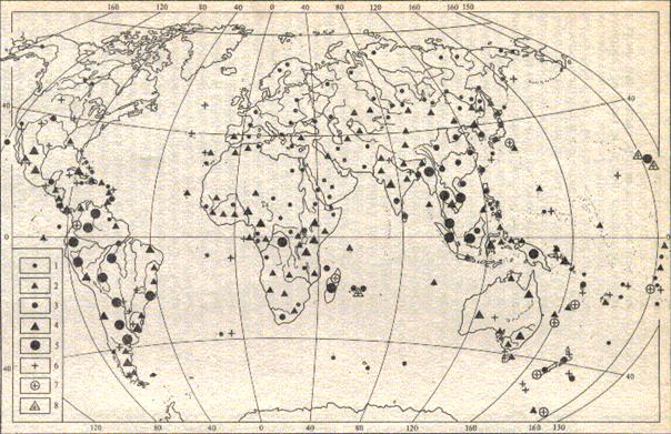 Рис.1. Распределение редких, находящихся под угрозой исчезновения и вымерших видов птиц: число редких исчезающих и требующих специальной охраны видов: 1-1-2, 2-3-5, 3-6-10, 4-11-20, 5 – более 20; число вымерших видов птиц 6-1-2, 7-3-5, 8-более 6.