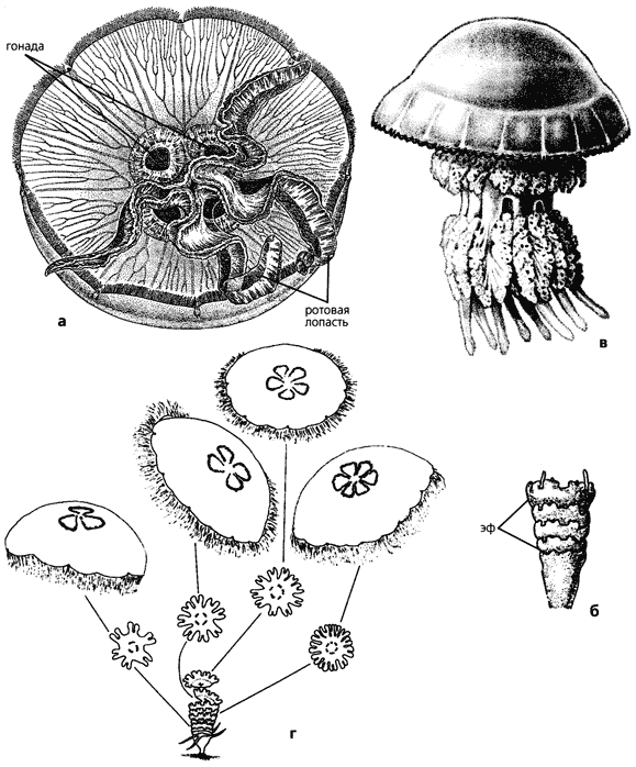 Медуза Aurelia aurita, вид снизу (а); образование эфир (эф) у аврелии (б); медуза Rhizostoma pulmo, вид сбоку (в); схема образования медуз с трех-, четырех- (норма), пяти- и шестилучевой симметрией из эфир, отрожденных одним и тем же полипом (г)