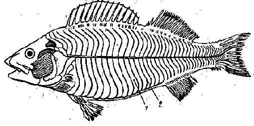 Рис. 1 Мускулатура костистой рыбы (по Кузнецову, Чернову, 1972):