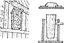 При отсутствии больших досок гнездовье можно сделать и из тарного ящика, необходимо лишь плотно подгонять дощечки, чтобы не было щелей в стенках. Поверхность доски, которая пойдет внутрь, строгать нельзя ни в коем случае, потому что птицы вылезают из домика, цепляясь коготками за стенки жилища, кормят птенцов, повиснув на них. По гладкой же поверхности лапки скользят, и птицы избегают селиться в таких гнездовьях. Сколачивать домик необходимо так, чтобы не было щелей между стенками. Крышку лучше делать съемной для наблюдения и очистки гнездовья. Для этого к нижней части крышки прибивают втулку таких размеров как дно, на которой крышка будет держаться. Втулку можно делать и не сплошную, а из двух планок, размещенных либо параллельно возле противоположных стенок, либо под прямым углом возле соседних. Прибивая планки, необходимо разместить их так, чтобы крышка не смещалась туда-сюда. Желательно ее также прикрепить чем-нибудь к стенкам. Проще всего сделать это при помощи проволочных петель. Для этого сверху одной из боковых стенок и на соответствующем ребре крышки забиваются по два гвоздика. Их загибают, чтобы образовались ушки, и соединяют гибкой проволокой - медной или алюминиевой. Одна или две пары таких ушек делаются и на противоположной стороне. Дальше из плотной стальной проволоки делают крючки. Сверху их прикручивают к ушкам, а снизу загибают и вставляют в нижние ушки. Образуются своеобраз ные крючки, которые крепко удерживают крышку и легко открываются. Можно сделать и боковую стенку, которая открывается, но это сложнее, Да и труднее избежать щелей.