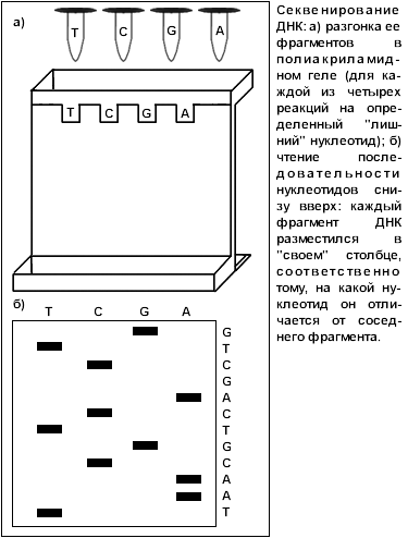 Вот и прозвучало слово "секвенирование". Так называется новейший, прославленный, подробнейший, точнейший… и, с позволения сказать, тягомотнейший метод картирования генома. Его сущность – полная расшифровка последовательности нуклеотидов. Чтобы в деталях объяснить, как она осуществляется, потребовалась бы двухчасовая лекция по молекулярной биологии. Посему в двух словах: из библиотеки клонов извлекают фрагмент ДНК, вновь клонируют, а получившиеся копии химически преобразуют в набор отрезков ДНК, различающихся по длине лишь на один нуклеотид (вот именно эту стадию практически невозможно описать общедоступным языком – настолько она сложна даже для генетика-профессионала). Затем упомянутые отрезки разделяются на гелевой пластинке в пульсирующем электромагнитном поле (пульс-форез). Последовательность нуклеотидов читают по фореграмме: каждый отрезок "уезжает" по гелевой пластинке настолько далеко, сколь велика его длина, и занимает место в одном из четырех столбцов – в зависимости от того, на какой нуклеотид (а их всего четыре типа) он длиннее соседнего.