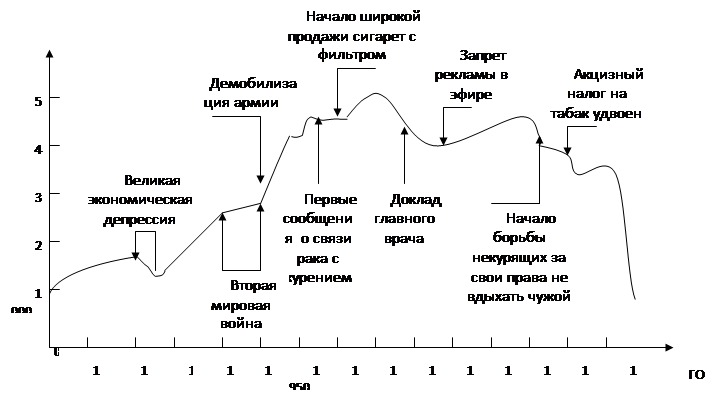 В результате началось падение доли курильщиков во взрослом населении США с 41 % до 25 %. Заметим, что в России курят 69 % мужчин и 49 % женщин. Число курящих подростков не уменьшается уже 10 лет.